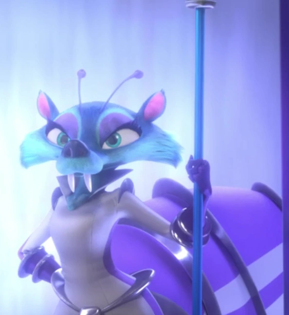 Фиолетовый мех, светло-фиолетовый живот, голубые глаза. Одета в белый скафандр.