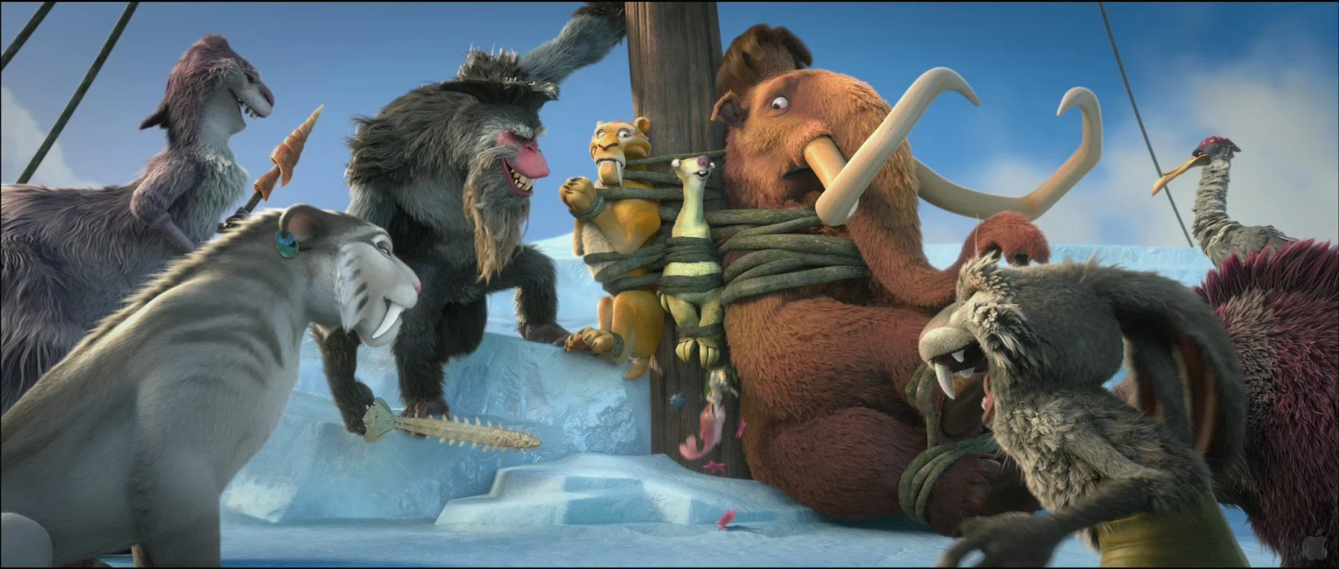 Сайлас обнаруживает льдину с Мэнни, Сидом, Диего и Бабулей. Он доносит Капитану Гатту об этом. Пиратский корабль подходит ко льдине. Капитан Гатт объясняет, что дома героев больше нет, и начинает нападение. Шира хватает Диего, когда он отрывал тросы, которые прицепились ко льдине, Флинн придавливает Сида, а Капитан Гатт выстреливает в Мэнни из пушки, оглушая его.
